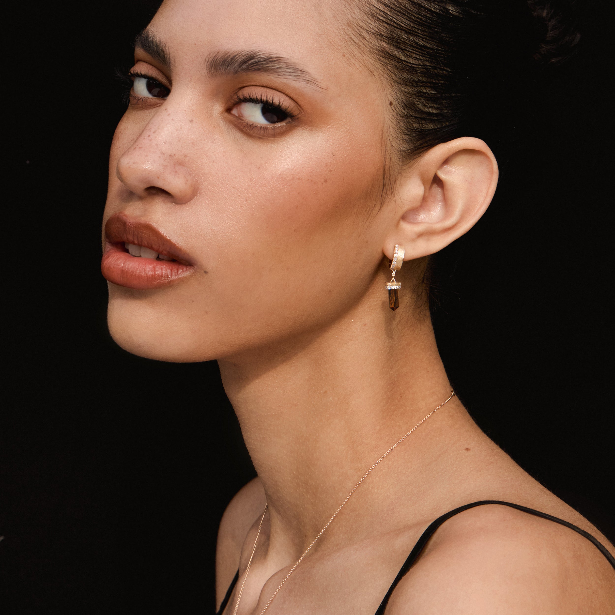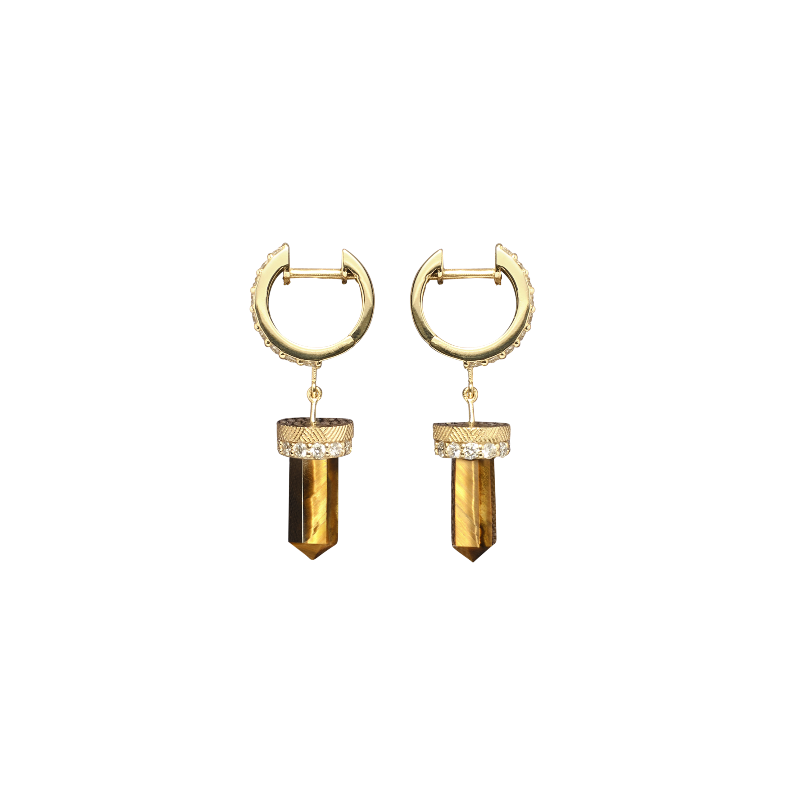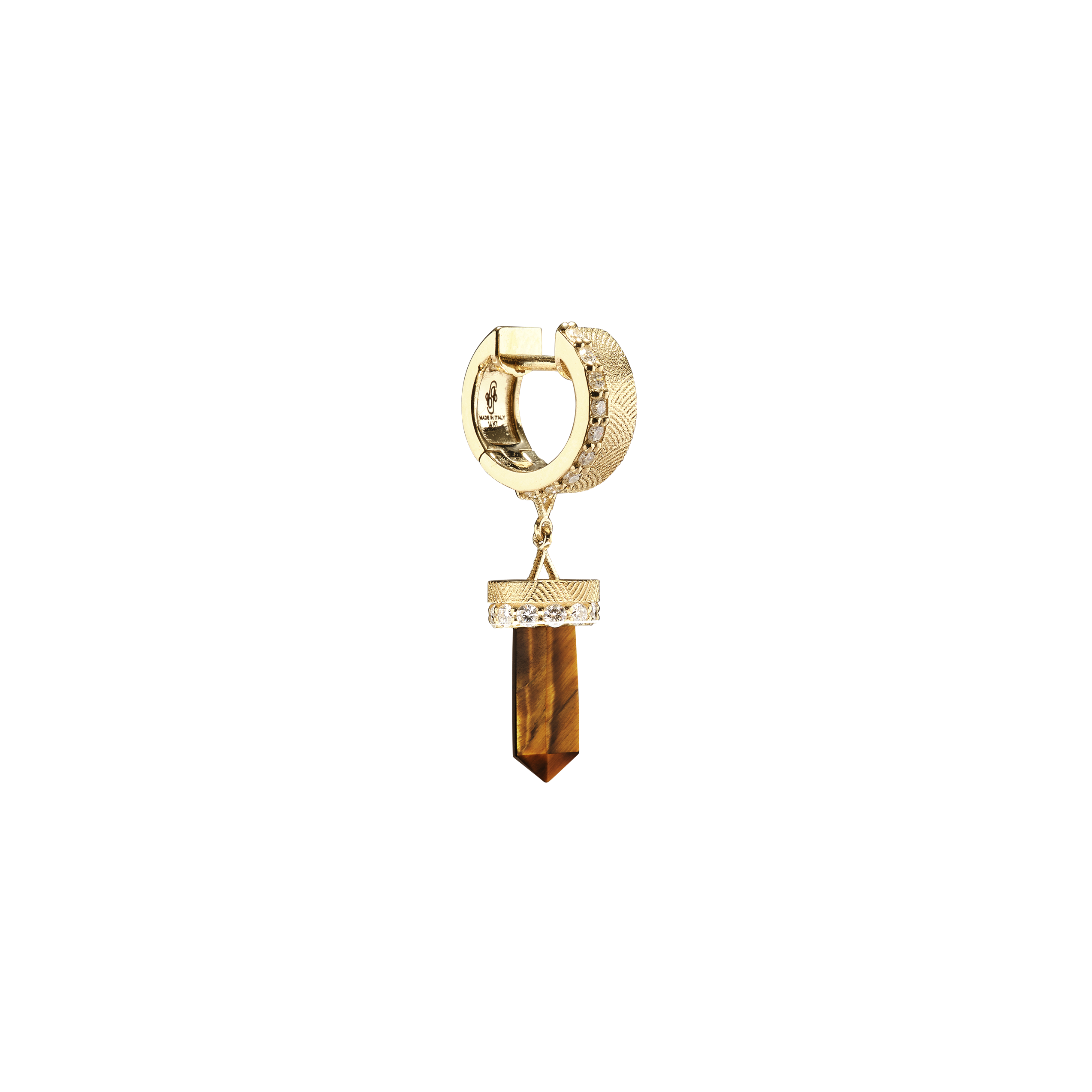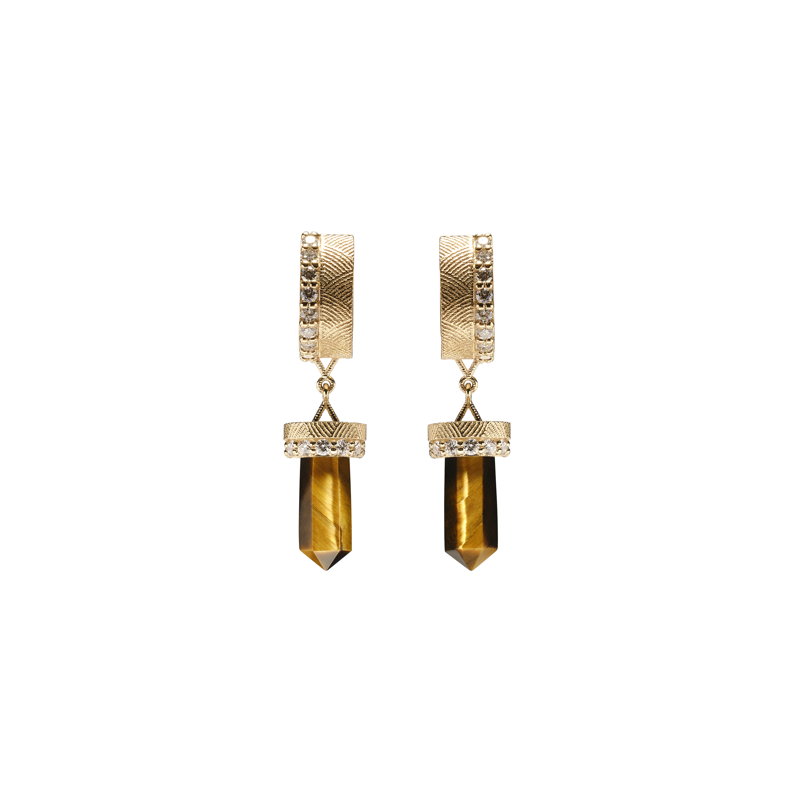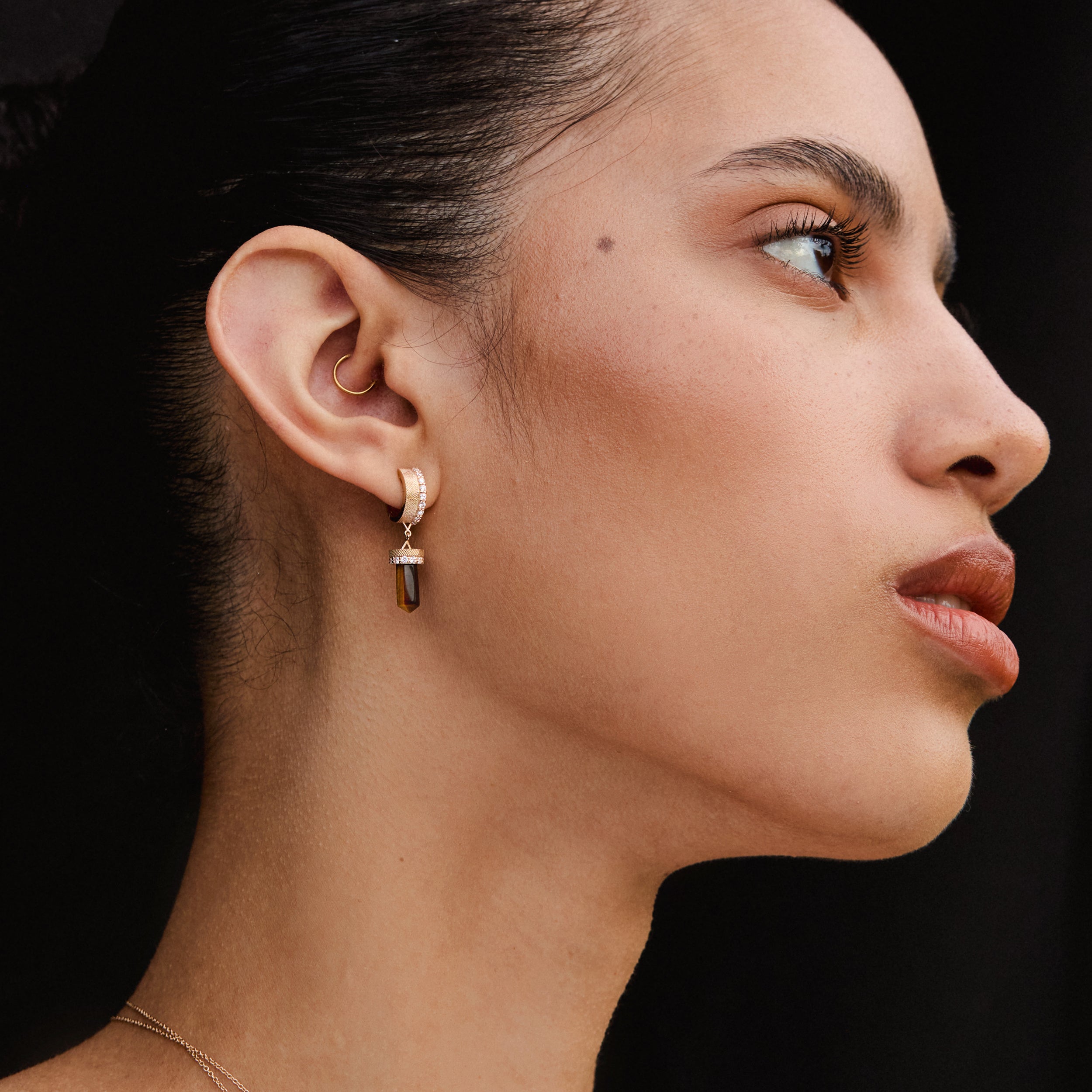 Celebration-worthy sprays of pave diamonds highlight the gorgeous and complex hue of a natural Tiger’s Eye crystal in this timeless and unique setting 14k gold setting. A delicate drop silhouette elegantly moves to create an everyday accessory that can be worn for any circumstance.