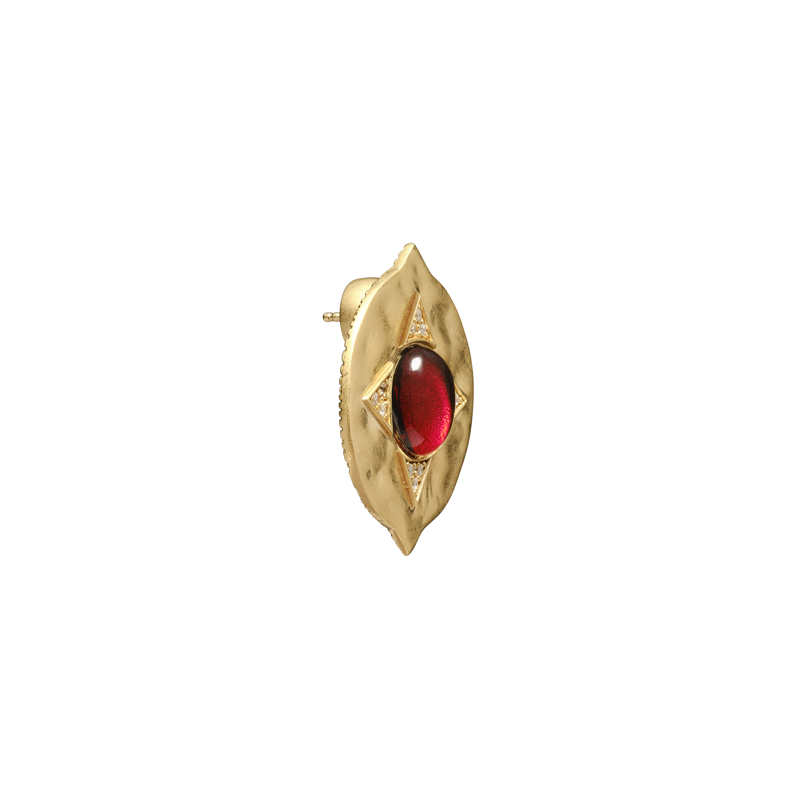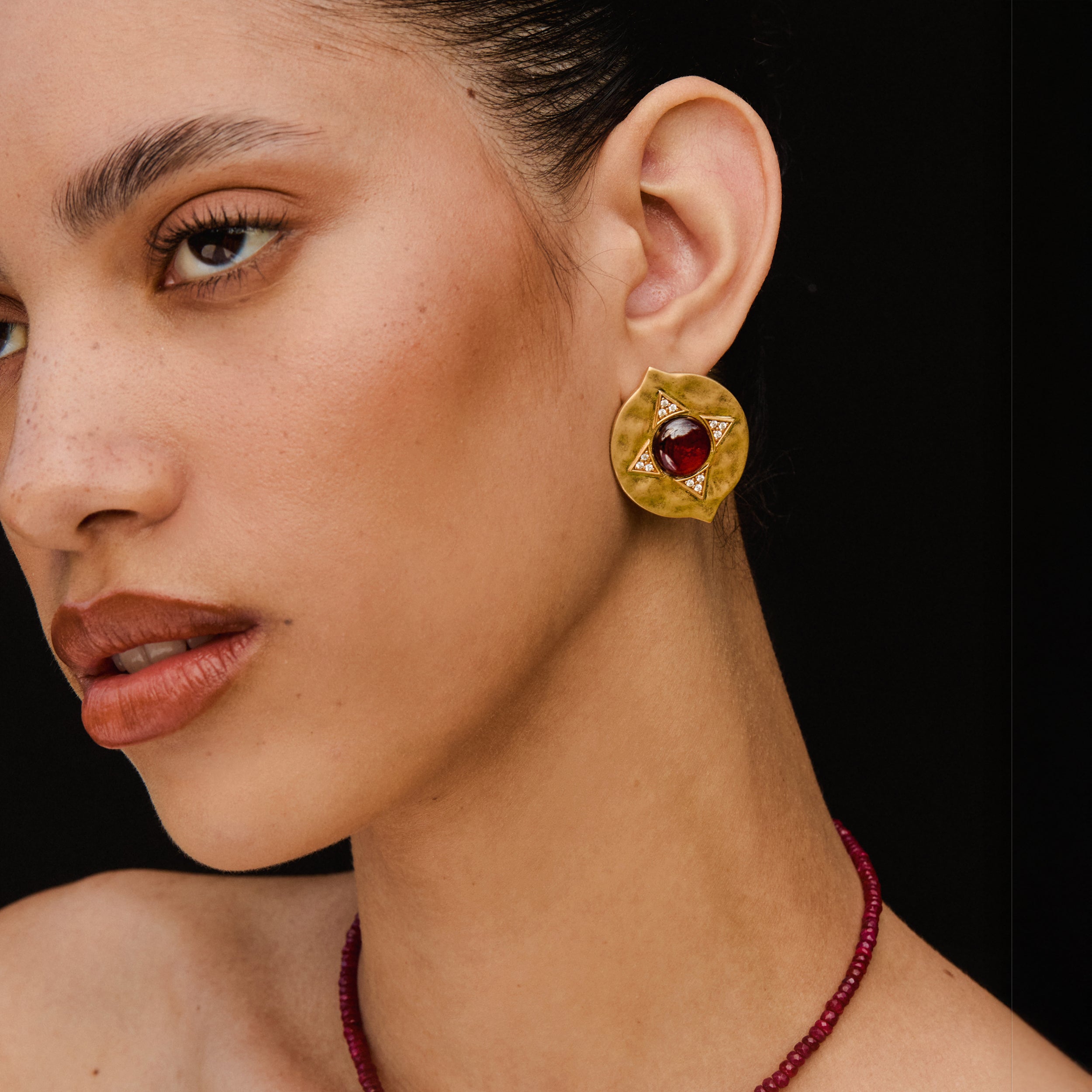 Handcrafted in Italy, The Coin Single Garnet Earrings co-designed with Sherri McMullen presents a single garnet in our iconic coin motif, flanked by pave diamonds that emerge from the ripple of hammered metal. A statement piece that will garner attention from its details both on the front and the back.