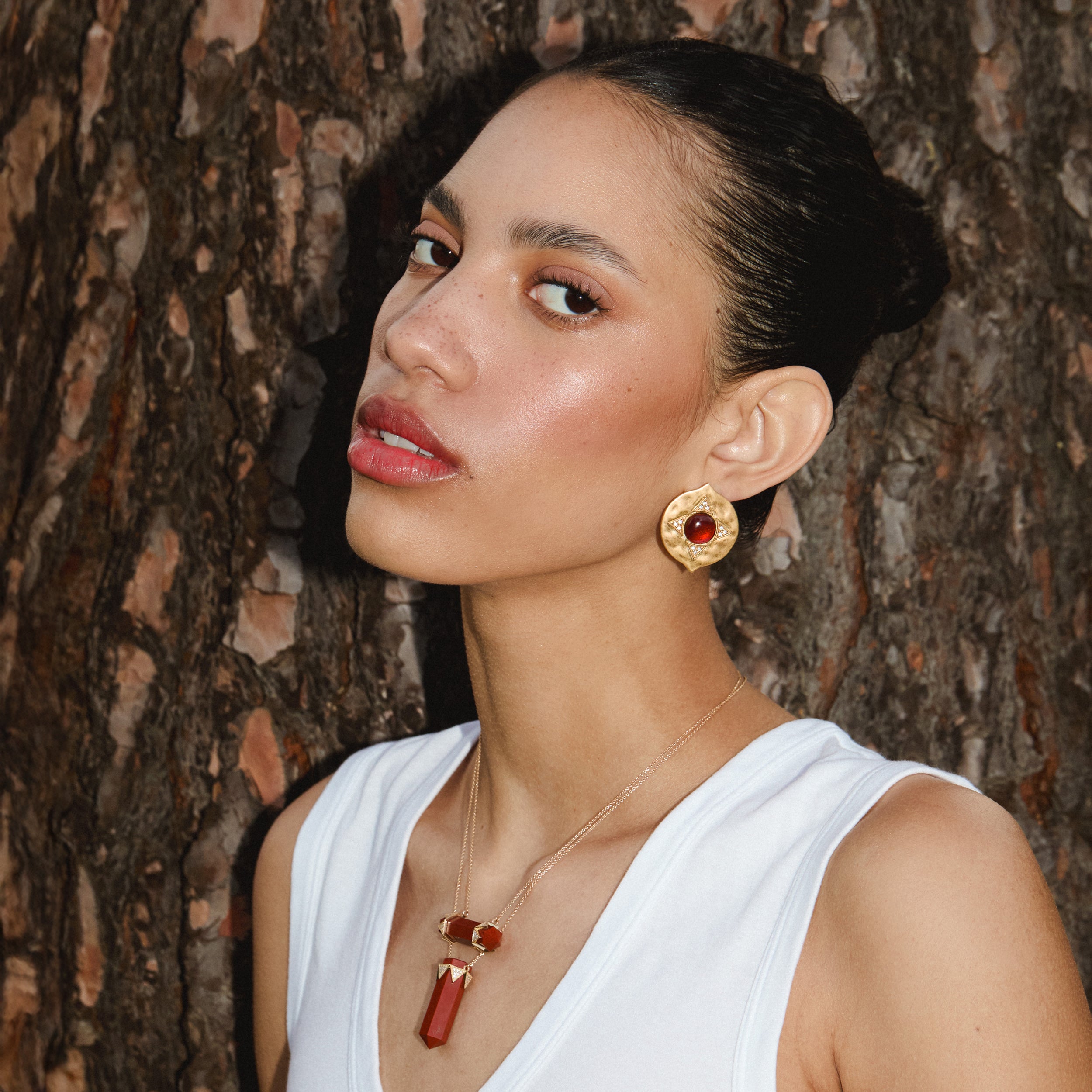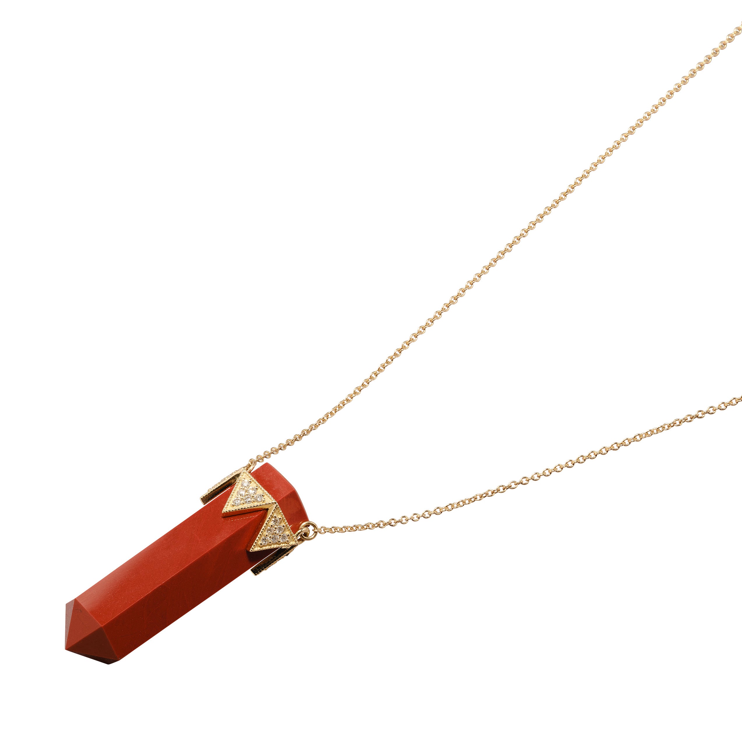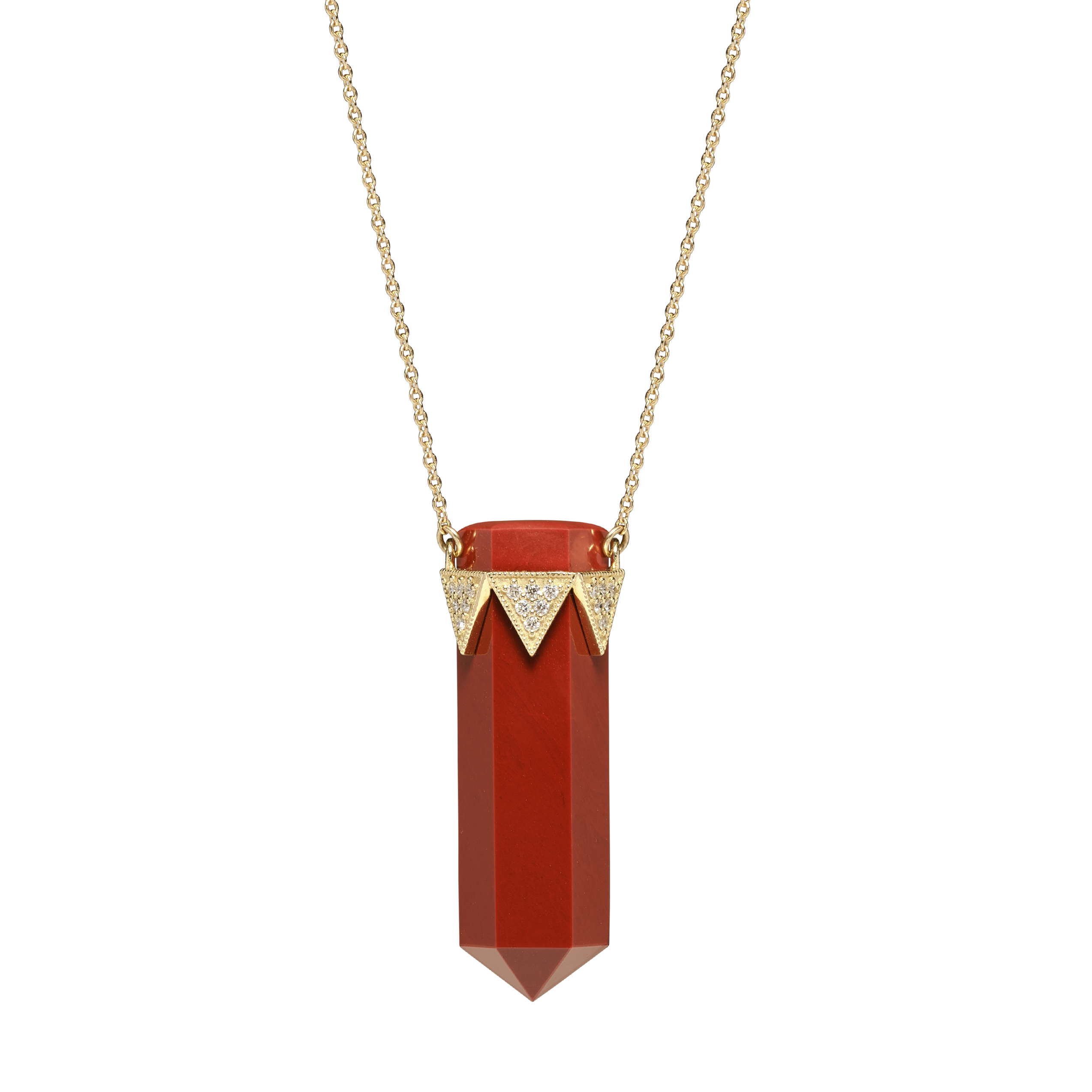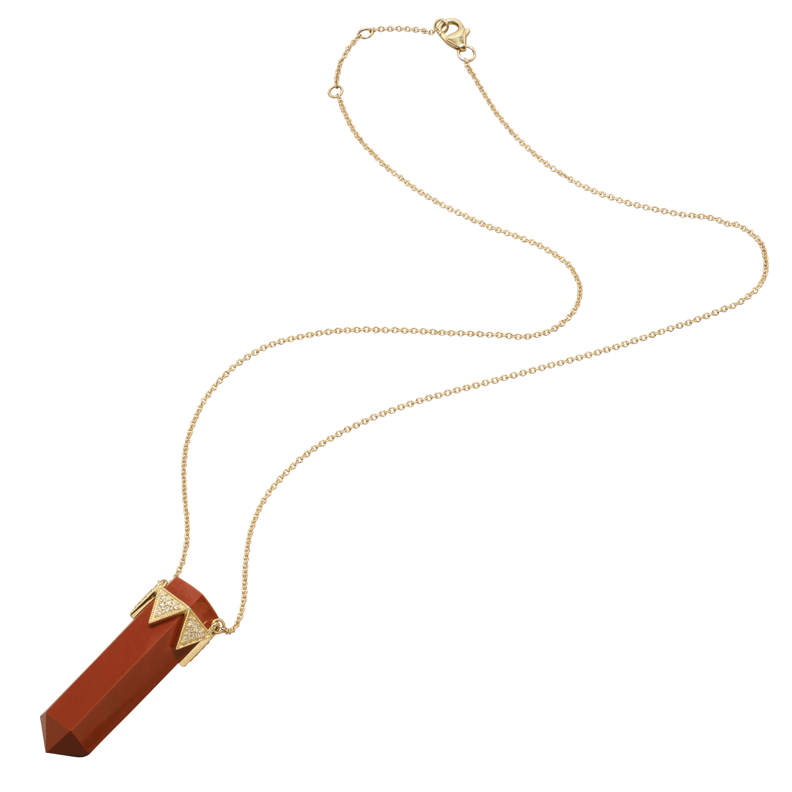 This iconic House of Harlow style now features Red Jasper as a central focus. Set in a triangular 14k crown of pave diamonds that clasps the captivating Red Jasper crystal.