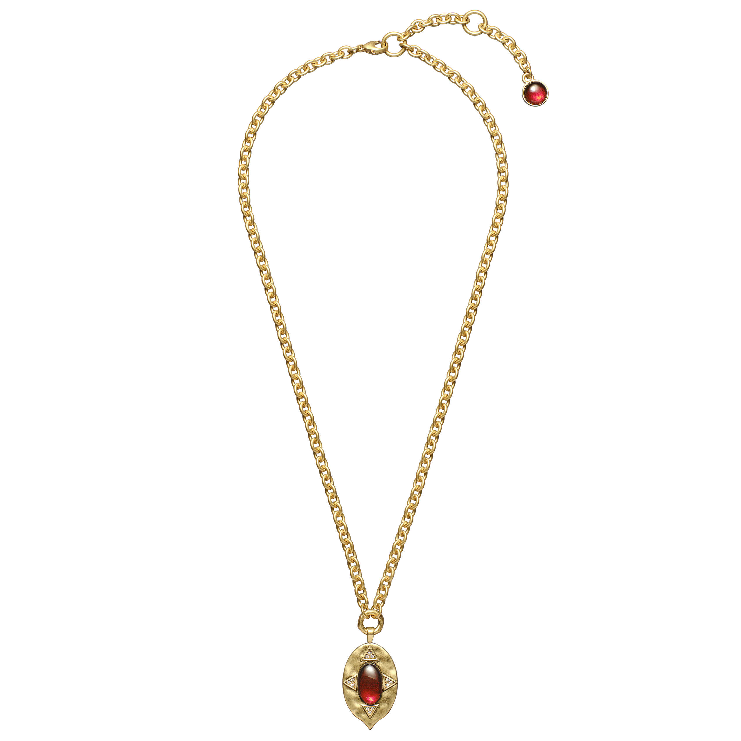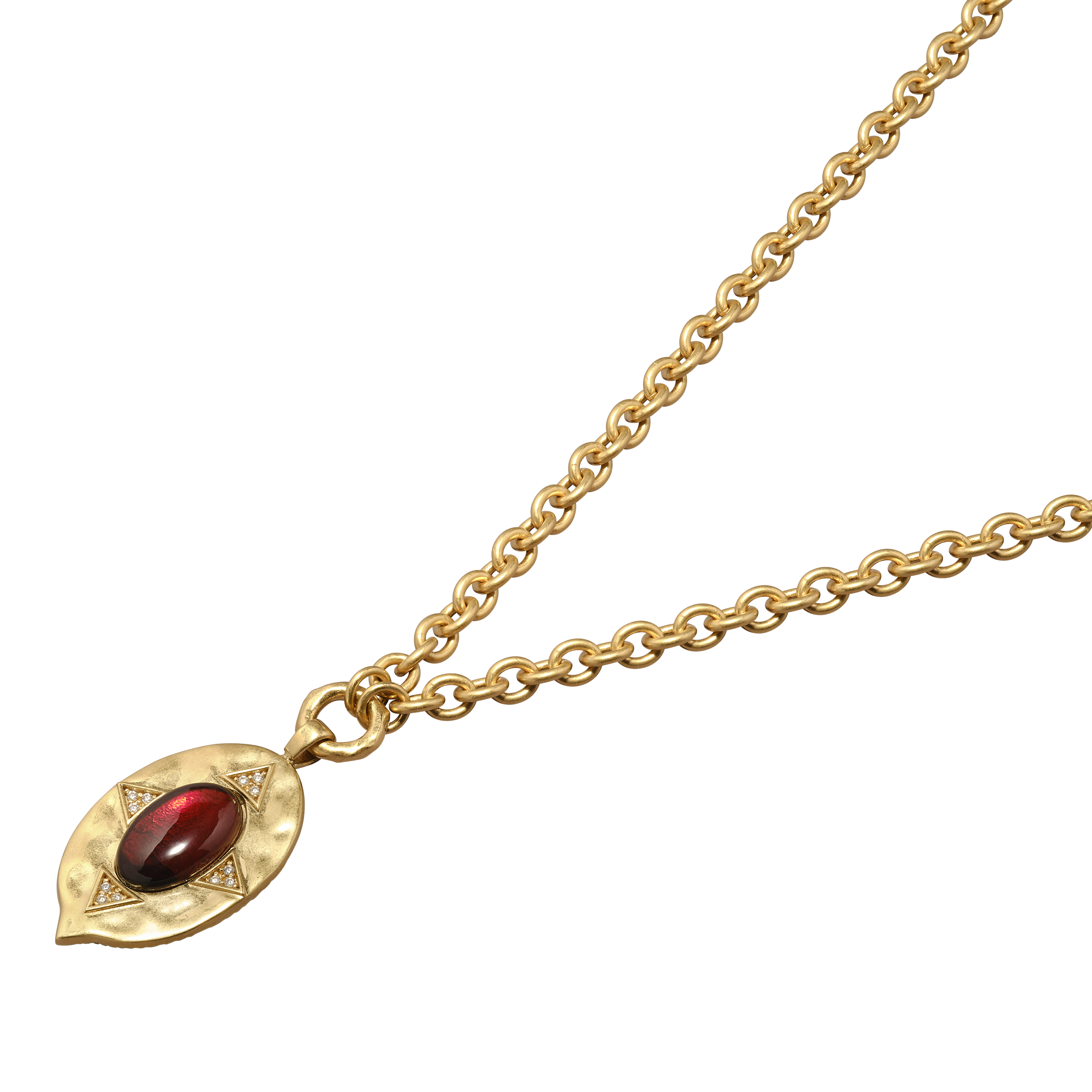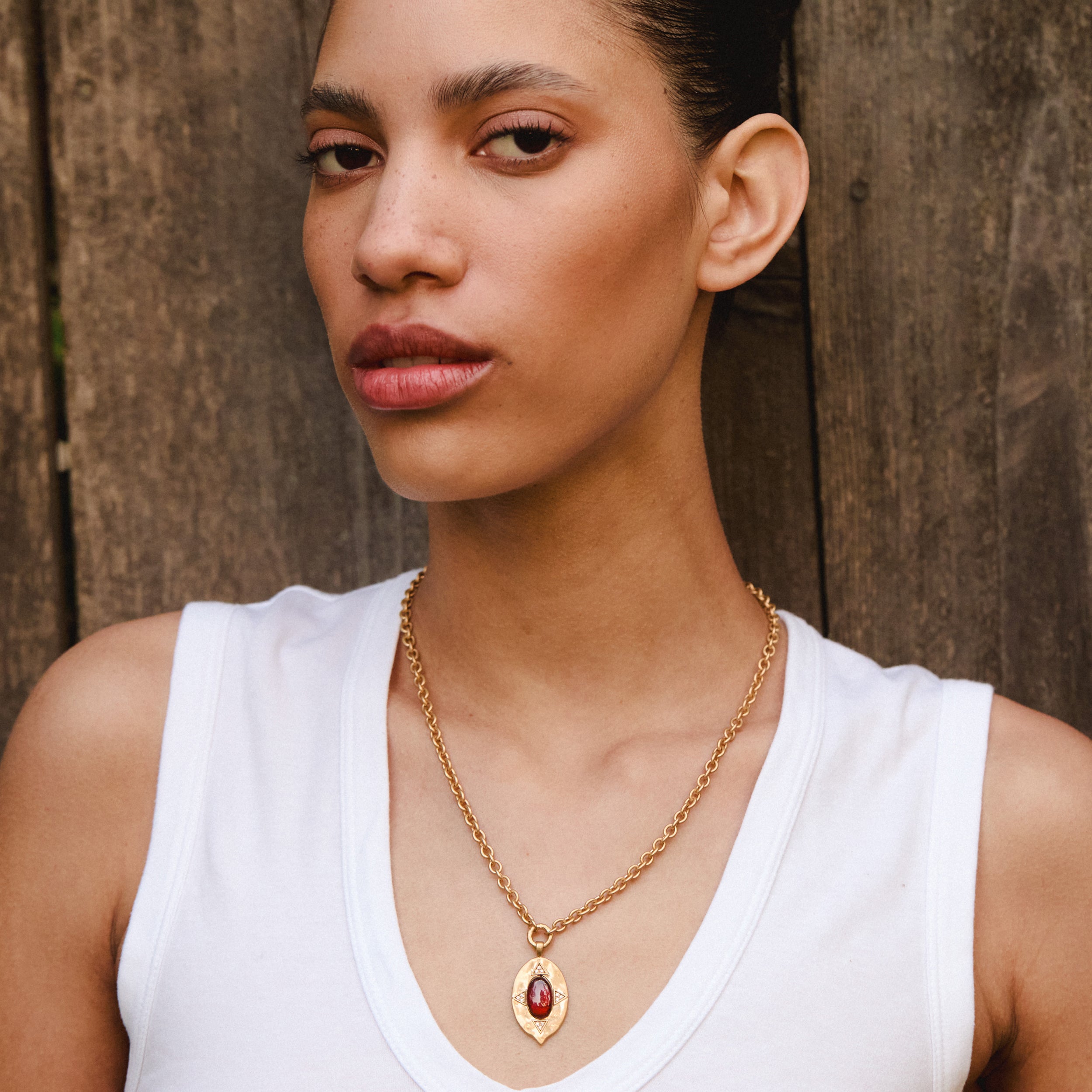 With the gravitas of a talisman and the craftsmanship of timeless jewelry, the Coin Garnet Pendant Necklace is the ideal piece for adding depth and interest to any wardrobe. Natural garnet sits in a halo of pave diamond points and dangles from a luscious cable link chain.