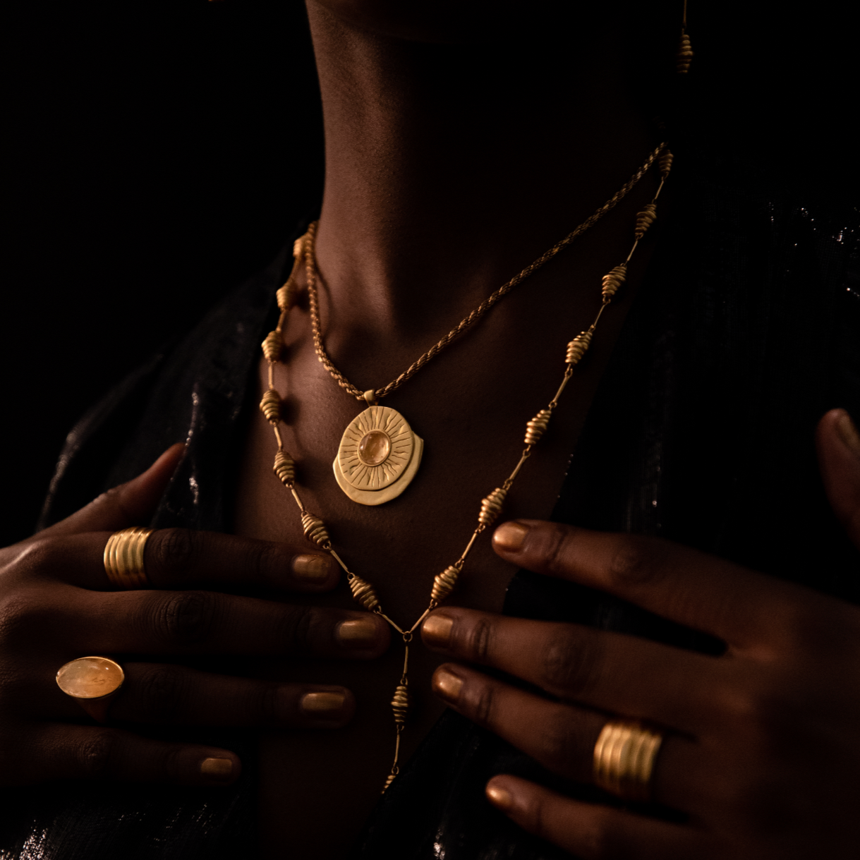 The Citrine Arch Medallion features a glowing hand cut-citrine set in an engraved sun inspired pendant. Wear it long or wrap the weighted twisted rope chain for a double layered look.