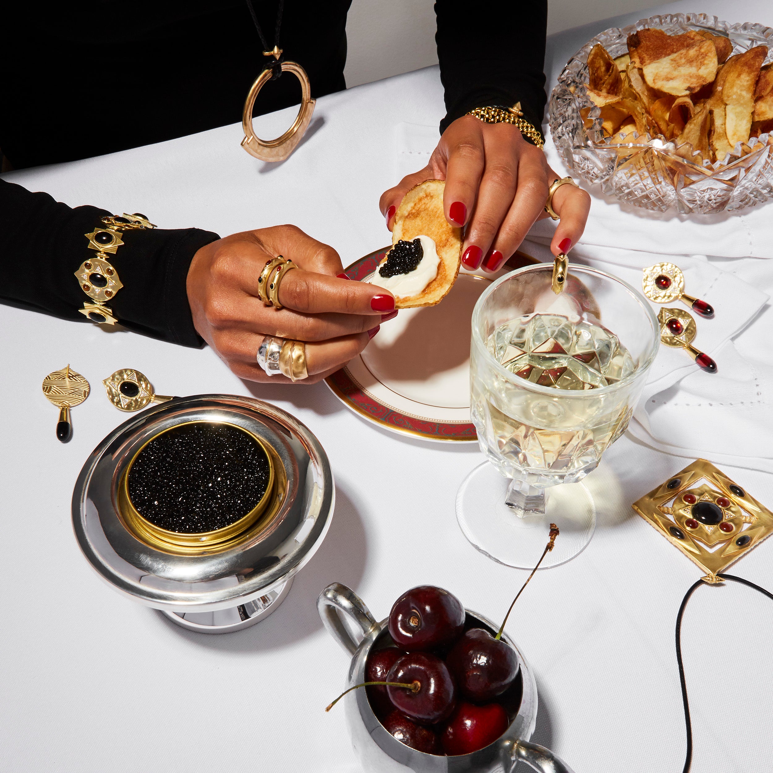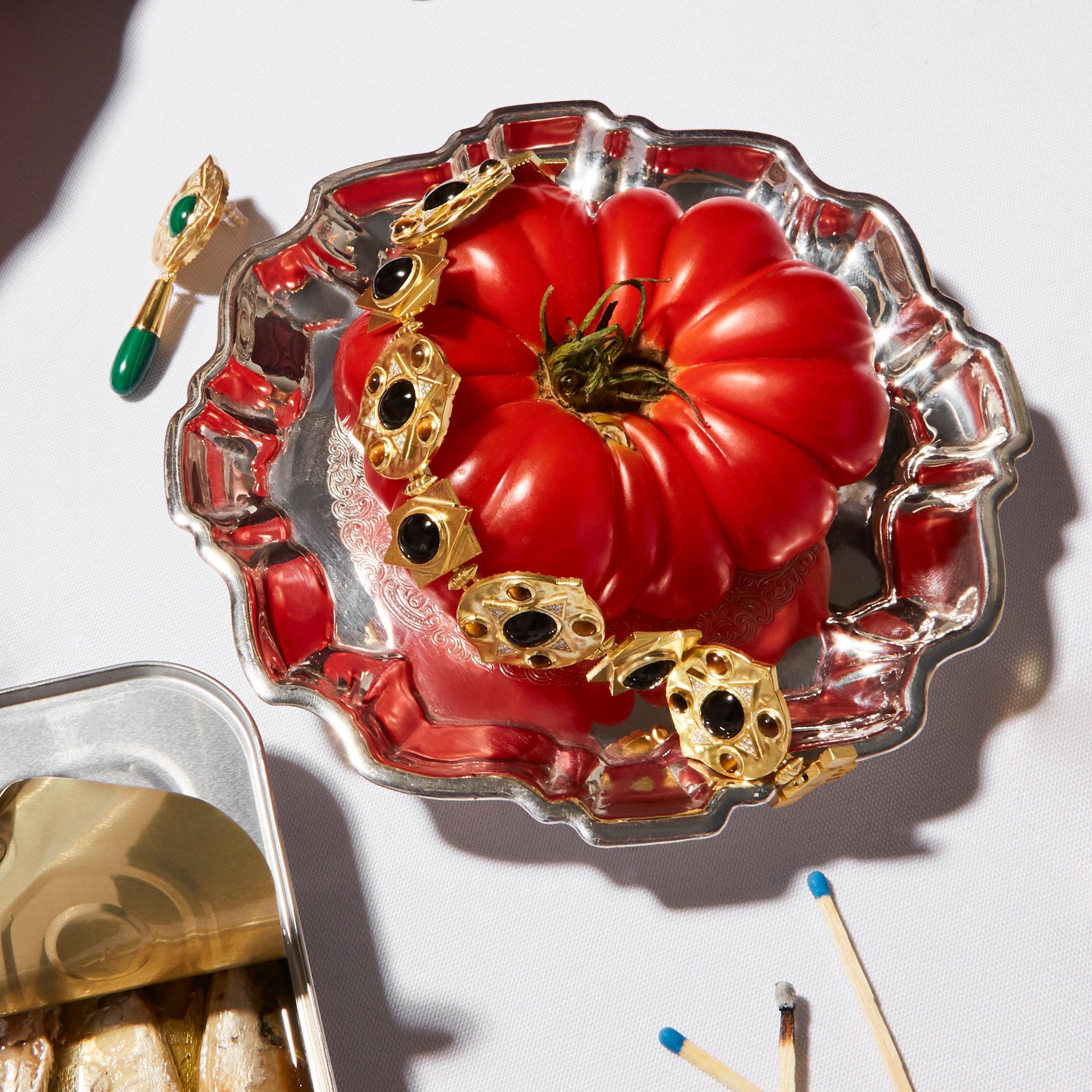 Wear your sensuality on your sleeve. Black onyx, tiger's eye, and glistening white diamonds make this statement hinged bracelet a timeless adornment that adds bold femininity to any look.